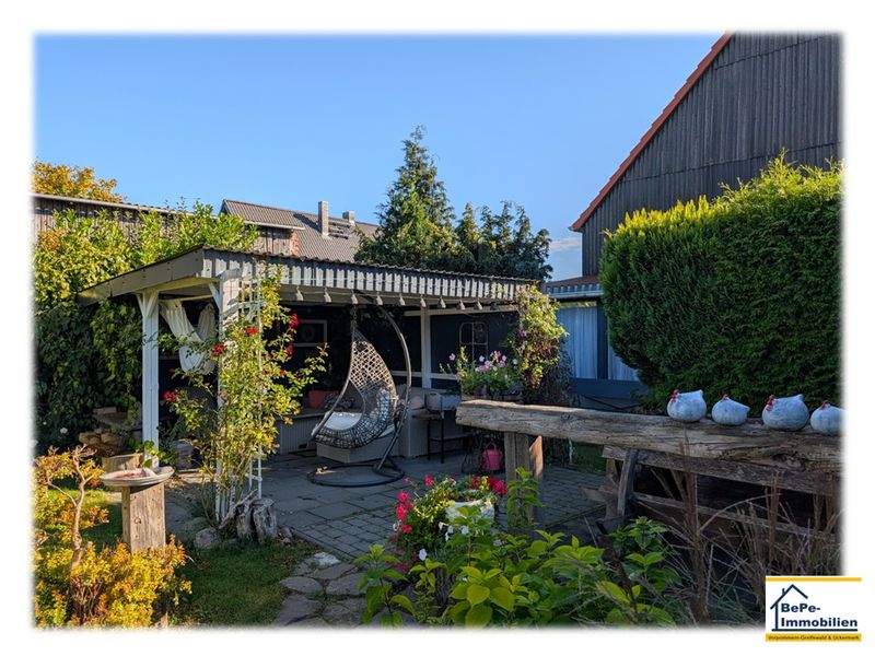 Hinter dem Nebengebäude, von der Straße und Nachbarn kaum einsehbar, befindet sich der ruhig gelegene, mit gemütlichen Sitzecken erschlossene, farbvolle Garten, hier finden Sie wertvolle Blumen, Kräuter und Bäume.